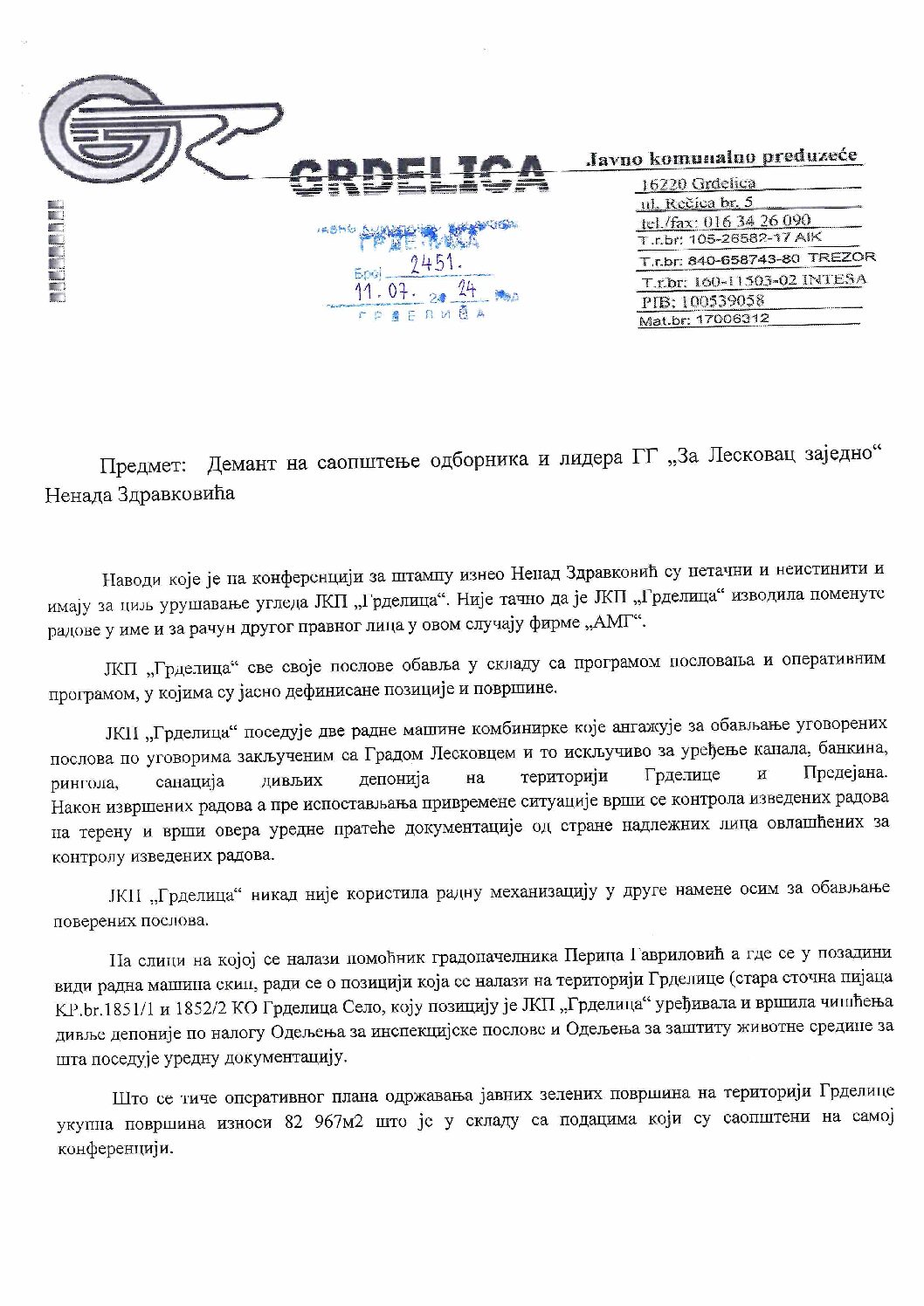 Iz Javno komunalnog preduzeća Grdelica danas je sttigao , kako je navedeno, “demant na saopštenje odbornika i lidera GG ” Za Leskovac zajedno” Nenada Zdravkovića.